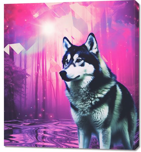 Obraz z serii pop art zatytułowany Wilczy Duch. Ta hipnotyzująca grafika łączy w sobie realistyczny wizerunek wilka z eterycznym, neonowym lasem w tle, co nadaje scenie onirycznego, mistycznego charakteru. Wilk, przedstawiony w pełnym majestacie, stoi na brzegu zaczarowanego jeziora, a tajemnicze, geometryczne kształty unoszą się w powietrzu, dodając kompozycji elementu fantastyki. Wyraziste kolory różu i fioletu tworzą niemal bajkową atmosferę. Obraz jest idealnym wyborem dla miłośników natury i jej mistycznych aspektów, świetnie nadaje się do wnętrz o tematyce przyrodniczej, pokojów dla młodzieży, lub jako unikatowy element dekoracyjny w przestrzeniach współczesnych.