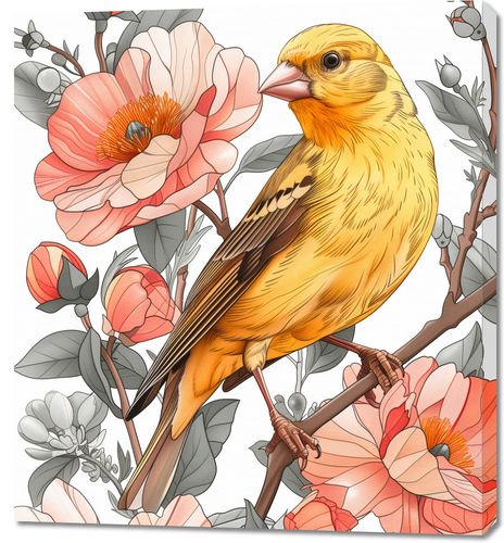 Obraz z serii natura zatytułowany Wiosenny Śpiewaczek przedstawia pełną detali i życia scenę, w której jaskrawo żółty ptak, przypominający kanarka, spoczywa na gałęzi wśród kwitnących kwiatów. Delikatne i subtelne kolory kwiatów w pastelowych odcieniach różu i pomarańczu tworzą miękki kontrast do żywego upierzenia ptaka. Precyzyjne linie i staranne cieniowanie nadają ilustracji realistycznego wyglądu, a roślinność w tle jest równie szczegółowo wykonana, co dodaje kompozycji głębi i bogactwa. Ten obraz to celebracja wiosennego odrodzenia i piękna natury, idealny do ożywienia każdego wnętrza, szczególnie pokoju dziennego, przestrzeni odpoczynkowej lub kawiarni o przytulnej atmosferze.