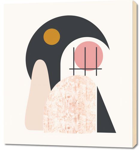 Obraz z serii boho zatytułowany Zakres Widoku.Obraz przedstawia abstrakcyjną kompozycję łączącą kształty zakrzywione i geometryczne, wykorzystującą miękką i spójną paletę kolorów. Dominujące kolory to czarny, odcienie różu, beż oraz akcent żółtego, tworząc poczucie równowagi i nowoczesnej estetyki. Kompozycja składa się z nakładających się form, w tym dużej czarnej figury z wycięciem koła, przez które prześwituje część różowego koła, oraz żółtego koła umieszczonego w obszarze czarnym, co może sugerować ciało niebieskie typu księżyc lub słońce. Obecne są również elementy fakturalne, dodające głębi i intrygi jednemu z kształtów, a proste linie przecinają różowe koło, przyczyniając się do wizualnego zainteresowania dziełem. Całość kompozycji przekazuje spokojne i współczesne wrażenie, prawdopodobnie czerpiąc inspirację z natury i sztuki abstrakcyjnej.