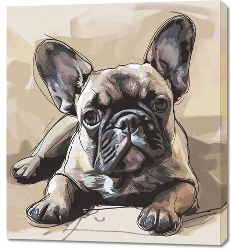 Obraz z serii wnętrza zatytułowany Zawsze Czeka, przedstawia realistycznie oddanego buldoga francuskiego w odcieniach beżu i brązu, z charakterystycznymi dużymi uszami i głębokim spojrzeniem. Pies leży na ciepło oświetlonym podłożu, a jego cień rozmywa się w tle. Użyta paleta kolorów nadaje obrazowi przytulny i domowy nastrój, podczas gdy szczegółowe tekstury sierści dodają głębi i realizmu. Ten obraz idealnie wpasuje się w wnętrza domowe, wnosząc element ciepła i towarzyskości. Może być doskonałym akcentem w salonie, gdzie domownicy i goście często gromadzą się na wspólne chwile, lub w przestrzeniach dedykowanych miłośnikom zwierząt.
