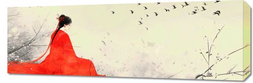 Obraz z serii motywy wschodnie zatytułowany Diva Na Gałęzi. Obraz przedstawia eteryczną scenę utrzymaną w delikatnej palecie barw z przewagą odcieni szarości i bieli, która kontrastuje z wyrazistą czerwienią. Na pierwszym planie widzimy postać kobiety w tradycyjnym, czerwonym stroju, z eleganckim uczesaniem i ozdobami we włosach, co sugeruje kulturalne lub historyczne znaczenie ubioru. Siedzi ona na gałęzi drzewa, a jej sukienka płynnie przechodzi w linie, które mogą symbolizować wiatr lub wodę, dodając grafice dynamiki. Tło jest stonowane i minimalistyczne, z subtelnymi plamami farby tworzącymi delikatną atmosferę. Nad sceną unosi się stado ptaków, które wzbija się do lotu, co może symbolizować wolność lub przejście. Całość kompozycji emanuje spokojem, melancholią i pięknem natury, a także może sugerować opowieść lub głębsze znaczenie skryte w postaci kobiety i jej połączeniu z otoczeniem.