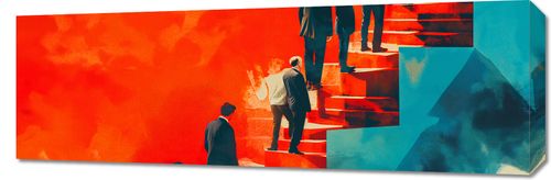 Obraz z serii abstrakcja zatytułowany Metafory Sukcesu. Przedstawia on różne postacie w formalnym ubiorze, wchodzące i schodzące po schodach, które rozdzielają się i zbiegają w różnych kierunkach. Tło obrazu jest podzielone na dwie kontrastujące strony - jedna w odcieniach czerwieni, a druga w chłodnych błękitach, symbolizując różne ścieżki i wybory w życiu zawodowym lub osobistym. Styl graficzny łączy elementy abstrakcyjne i figuralne, a silne kontrasty kolorystyczne podkreślają dynamikę i złożoność podejmowanych decyzji. Obraz ten mógłby być inspirującym dodatkiem do biura lub przestrzeni pracy, zachęcającym do refleksji nad własnym rozwojem i aspiracjami.