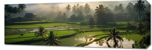 Obraz z serii pejzaże zatytułowany Świt nad Tarasami. Ta zachwycająca scena przedstawia malownicze tarasy ryżowe, kąpane w ciepłym świetle wschodzącego słońca. Mgła delikatnie opada na zielone pola, a w tle majaczą zarysy gór, dodając głębi i tajemniczości krajobrazowi. Palmy i tradycyjne chaty dopełniają obrazu, tworząc wizję spokoju i harmonii z naturą. Obraz emanuje spokojem i jest hołdem dla prostoty wiejskiego życia. Idealnie wkomponuje się w przestrzenie, gdzie chcemy wprowadzić element uspokajający i zainspirowany naturą, jak medytacyjne spa, poczekalnie w klinikach wellness czy prywatne biblioteki.