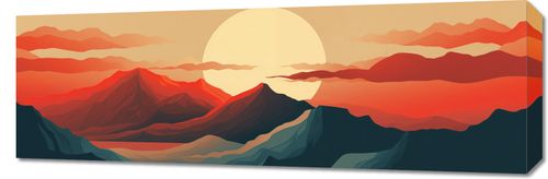 Obraz z serii pejzaże zatytułowany Zachód Słońca nad Górami. Ten graficzny obraz przedstawia stylizowany krajobraz górski o zachodzie słońca, z dominującymi ciepłymi odcieniami czerwieni i pomarańczy, które kontrastują z spokojnymi tonami ciemnego morza. Harmonia kolorów i płynne linie nadają kompozycji spokojny, ale zarazem wyrazisty charakter. Doskonale sprawdzi się jako centralny punkt w każdym pomieszczeniu, wprowadzając element ukojenia i inspirującej natury. Idealny dla tych, którzy pragną dodać do swojego wnętrza nutę artystycznego spokoju.