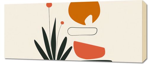 Obraz z serii boho zatytułowany Abstrakcyjny Zen. Kompozycja obrazu łączy prostotę z abstrakcją, przedstawiając zestaw harmonijnie zbalansowanych kształtów i form. Wyraźne, ciemnozielone liście tworzą bazę dla kompozycji, z której wyrastają dwa okrągłe kwiaty na cienkich łodygach. Ich delikatność jest dodatkowo podkreślona przez dużą, okrągłą formę w ciepłym pomarańczu i spokojny, kremowy tło. Obraz sprawia wrażenie spokojnego i medytacyjnego, co sprawia, że jest idealny do miejsc przeznaczonych na wyciszenie i relaks, takich jak jasne, przestronne salony, pokoje do medytacji czy minimalistyczne sypialnie.