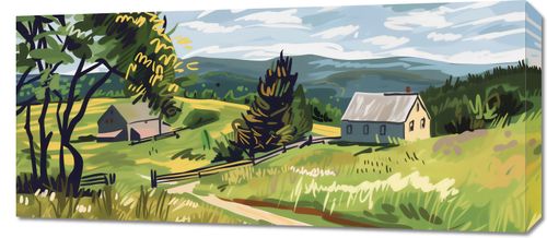 Obraz z serii pejzaże zatytułowany Bujna Wieś. Plakat przedstawia malowniczą scenę z wiejskiego krajobrazu, gdzie dominuje pastelowa paleta barw. W centralnym punkcie obrazu widzimy prostą, białą chłopską chatę z szarym dachem, otoczoną przez bujną, zieloną roślinność i rozległe pola. Drzewa z żółtymi akcentami wskazują na wczesną jesień, a ich rozmieszczenie i forma dają wrażenie naturalnego, rustykalnego otoczenia. Jasne, dynamiczne pociągnięcia pędzlem na niebie nadają scenie lekkości i ruchu, podczas gdy delikatnie zaznaczone wzgórza w tle oferują poczucie głębi i przestrzeni. Kolorystyka obrazu, łącząca ciepłe odcienie żółci z chłodnymi błękitami, przyciąga oko i sprawia, że scena jest zarówno spokojna, jak i energetyczna. Ta ilustracja może przywoływać uczucia nostalgii i spokoju, a także zachęcać do refleksji nad pięknem prostego życia na wsi.