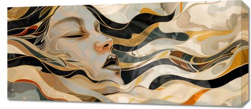 Obraz z serii abstrakcja zatytułowany Głębia. Prezentuje abstrakcyjne, stylizowane przedstawienie twarzy kobiety, zatopionej w płynnych, onirycznych formach przypominających fale lub wstęgi tkaniny. Szeroka gama barw, od głębokich czerni, przez delikatne beże, aż po złote i pomarańczowe akcenty, tworzy bogatą paletę kolorystyczną. Kontury twarzy są wyraźne i zmysłowe, z zamkniętymi oczami i lekko rozchylonymi ustami, co może sugerować stan zadumy lub ekstazy. Artystyczne linie tworzą złudzenie ruchu i płynności, a cała kompozycja jest zarówno dynamiczna, jak i harmonijna. Obraz ten może być interpretowany jako metafora piękna ludzkiego ducha, muzyki, sztuki lub emocji. Idealnie nadawałby się do eleganckich, nowoczesnych wnętrz, gdzie może stanowić główny punkt wizualny, przyciągając uwagę i inspirując do refleksji.