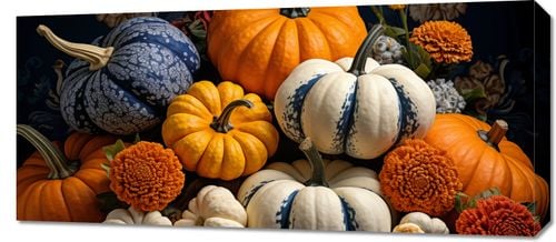 Obraz z serii natura zatytułowany Jesienne Bogactwo. Ta kompozycja to celebracja urodzaju jesieni, ukazująca bogactwo i różnorodność dyń w pełnej krasie. Kontrastujące faktury i kolory od kremowej bieli do głębokiej pomarańczy są uzupełnione o ciepłe odcienie złotych kwiatów, tworząc obraz, który emanuje ciepłem i domową atmosferą. Idealny do dekoracji kuchni lub jadalni, gdzie może inspirować do sezonowych przetworów i przygotowań świątecznych potraw. Ten obraz będzie również doskonałym dodatkiem do przestrzeni takich jak sklepy z dekoracjami domowymi, kawiarnie lub restauracje, które chcą wprowadzić atmosferę przytulności i naturalnego piękna.