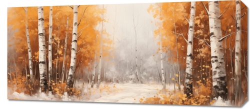 Obraz z serii pejzaże zatytułowany Jesienne Brzozy. Scena przedstawia ścieżkę snującą się przez las brzozowy, którego złoto-żółte liście są symbolem przemijania i naturalnego piękna jesieni. Delikatne pnie drzew z charakterystyczną białą korą wyłaniają się z mglistego tła, tworząc poczucie głębi i spokoju. Gra światła i cienia nadaje kompozycji miękkości, a spadające liście dodają dynamiki. Ten obraz jest idealny do przestrzeni pełnych ciepła i spokoju, takich jak salony, pokoje relaksacyjne, czy miejsca oczekiwania w gabinetach terapeutycznych, gdzie może wprowadzać atmosferę kontemplacji i uspokojenia.