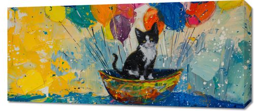 Obraz z serii abstrakcja zatytułowany Kot na Łodzi. Przedstawia on małego, czarno-białego kota siedzącego w malutkiej, kolorowej łódce, unoszącej się na żywych, błękitnych falach. Nad łódką unosi się bujny klaster jasnych, kolorowych balonów, które dodają obrazowi elementów wesołości i lekkości. Praca jest pełna energii, z widocznymi na całej powierzchni obrazu śladami energicznych pociągnięć pędzlem i plam farby, co nadaje dziełu nieco abstrakcyjny i ekspresyjny charakter. Ta mieszanka realistycznych i fantastycznych elementów tworzy ciepłą i zapadającą w pamięć scenę, która może wywoływać uśmiech i poczucie radości.