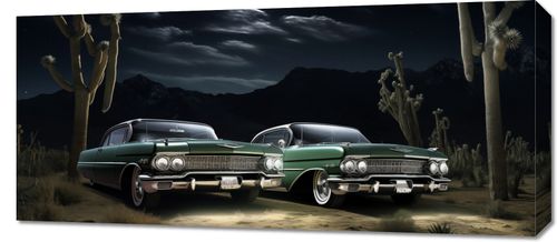 Obraz z serii wnętrza zatytułowany Nostalgiczne Spotkanie ukazuje dwa klasyczne samochody z lat 50., zaparkowane bok w bok pod rozgwieżdżonym nocnym niebem. W tle majestatyczne, ciemne góry rysują się na horyzoncie, a pomiędzy nimi a samochodami rozpościera się dzika pustynna sceneria, z charakterystycznymi kaktusami saguaro. Oświetlone przez delikatne światło księżyca, pojazdy prezentują swoje błyszczące, zadbane karoserie, które odbijają blask gwiazd. Scena ta emanuje spokojem i bezczasowością, przywołując wspomnienia podróży i przygód z minionych epok. Ten obraz doskonale odnajdzie się w przestrzeniach miłośników motoryzacji, retro kawiarniach lub jako elegancki akcent w salonach domowych, inspirując do marzeń o podróży przez historię i amerykański krajobraz.