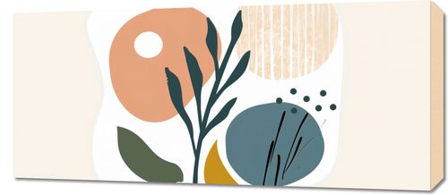 Obraz z serii boho zatytułowany Pastel Owoców.Obraz przedstawia stilizowany obraz natury, gdzie organiczne formy i kształty łączą się w nieoczywisty sposób. W kompozycji dominuje duża, pastelowa forma przypominająca owoce lub słońce, która kontrastuje z subtelnym tłem w delikatnych odcieniach beżu ozdobionym wertykalnymi liniami. Obok widnieją płynne, ciemnozielone liście oraz zaokrąglone, geometryczne formy w odcieniach szarości i musztardy, uzupełnione o subtelne graficzne akcenty. Obraz będzie pięknie komponował się w przestrzeniach poszukujących elementów natury w abstrakcyjnej, uproszczonej formie, idealnie nadając się do nowoczesnych salonów, kreatywnych przestrzeni pracy lub jako delikatny akcent w minimalistycznej sypialni.