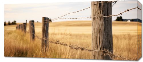 Obraz z serii pejzaże zatytułowany Płot na Polu. Obraz przedstawia rustykalny drewniany płot z drutem kolczastym, ciągnący się wzdłuż złocistego, zbożowego pola. Delikatne odcienie złota i brązu, w połączeniu z subtelnie rozmytym tłem, tworzą poczucie głębi i przestrzeni. Ten spokojny, wiejski krajobraz wprowadza atmosferę relaksu i odprężenia, idealnie nadając się do wnętrz inspirowanych naturą lub jako ukojenie dla zaganianych mieszkańców miast. Doskonały do salonu, jadalni lub jako element wypoczynkowej przestrzeni.