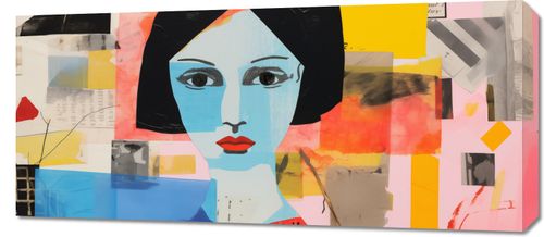 Obraz z serii abstrakcja zatytułowany Prześwit Wzroku przedstawia abstrakcyjny portret kobiety, skomponowany z różnorodnych elementów kolażu. Dynamiczna kompozycja łączy w sobie wyraziste kolory i tekstury, z fragmentami tekstu, geometrycznymi kształtami i abstrakcyjnymi formami. Centralną figurą jest twarz kobiety o prostych, ale silnych rysach, z kontrastującymi niebieską cerą, czarnymi włosami i czerwonymi ustami, co nadaje jej wyrazistości i głębi. Tło składa się z żywych żółtych i pomarańczowych plam, przeplatających się z chłodnymi błękitami i neutralnymi odcieniami, tworząc wrażenie różnorodności i dynamizmu współczesnego życia. Obraz ten może stanowić inspirujący element dekoracyjny w nowoczesnych przestrzeniach mieszkalnych, galeriach sztuki lub kreatywnych miejscach pracy, stymulujący wyobraźnię i refleksję nad naturą sztuki.