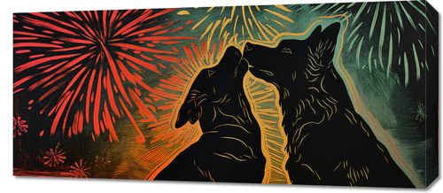 Obraz z serii abstrakcja zatytułowany Psi Uścisk. Przedstawia on dwie sylwetki psów, które wydają się być zwrócone ku sobie w gest podobny do uścisku, na tle intensywnie kolorowego nieba z fajerwerkami. Barwy od czerwieni po żółcie i zielenie tworzą tło, które wygląda jak nocne niebo w trakcie świętowania. Styl graficzny jest dynamiczny i pełen energii, a linie tworzące sylwetki psów są płynne i wyraziste. Ten obraz wyraża radość i nieodłączną więź pomiędzy zwierzętami, będąc doskonałym dodatkiem do wnętrz, gdzie chcemy podkreślić ciepło i pozytywne emocje.
