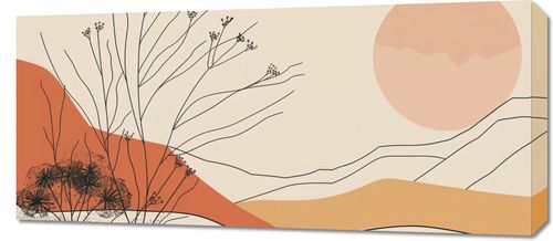 Obraz z serii boho zatytułowany Pustynna Wydma. Obraz ukazuje krajobraz z delikatnie zarysowanymi roślinami na tle łagodnych, pustynnych wydm. Spokojna kolorystyka, opierająca się na miękkich odcieniach beżu, pomarańczy i czerwieni, oddaje kojący klimat zmierzchu. W tle widoczne jest wielkie, ciepłe słońce, które rzuca złoty blask na całą scenę, nadając jej harmonijny charakter. Ten obraz będzie piękną dekoracją do wnętrz, które pragną wprowadzić elementy natury w połączeniu z minimalistycznym designem. Jego uspokajające barwy i proste linie idealnie wpasują się w przestrzenie takie jak sypialnie, salony, miejsca odpoczynku, czy nawet biura kreatywne, pragnące wykreować przestrzeń sprzyjającą relaksowi i inspiracji.