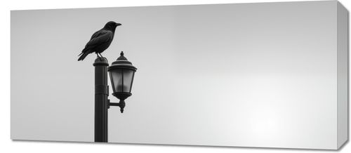 Obraz z serii wnętrza zatytułowany Samotny Postój Kruka. Prezentuje on sylwetkę kruka spoczywającego na klasycznej latarni ulicznej, uchwyconą w monochromatycznej palecie szarości. Ten spokojny, lecz sugestywny obraz jest symbolem refleksji i tajemnicy, doskonale wpisując się w klimat współczesnych przestrzeni miejskich. Praca ta z pewnością stanie się wyrazistym dodatkiem do nowoczesnych wnętrz, takich jak lofty czy minimalistyczne salony, a także wniesie element zastanowienia do przestrzeni publicznych takich jak galerie, kawiarnie i biblioteki, gdzie odosobnienie miesza się z miejskim zgiełkiem.