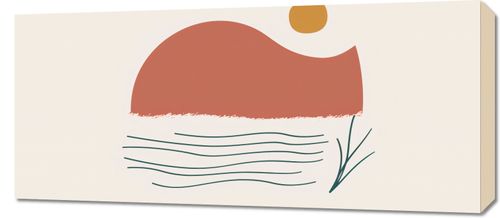 Obraz z serii boho zatytułowany Serenada Zachodzącego Słońca.Ten obraz oddaje spokojny krajobraz zachodu słońca w stylu minimalistycznym. Duży, łagodny wzgórze w ciepłym czerwonym kolorze dominuje kompozycję, a powyżej, w spokojnym niebie, słońce świeci w odcieniach złota. Proste linie poniżej wzgórza mogą symbolizować spokojne fale wody, a zielone elementy przywodzą na myśl ciche szumienie traw. Dzieło to doskonale nadaje się do każdego wnętrza, w którym chcemy wprowadzić elementy spokoju i natury, zachowując jednocześnie prostotę i czystość form. Świetnie sprawdzi się w przestrzeniach takich jak salon, sypialnia, czy miejsce przeznaczone do medytacji i wyciszenia.