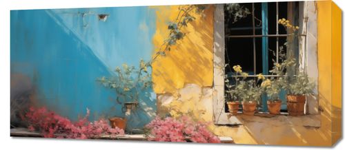 Obraz z serii wnętrza zatytułowany Słoneczna Ulica przenosi nas do malowniczego zakątka, gdzie czas zdaje się płynąć wolniej. Słoneczne, ciepłe barwy ożywiają szorstką fakturę ścian, a kontrastujący błękit okiennych żaluzji dodaje scenie głębi. Kaskady rozkwitających kwiatów w doniczkach i zwisające pnącza roślin tworzą bujną, naturalną dekorację, która nadaje kompozycji poczucie domowego ciepła i urokliwości. Ten kawałek miejskiego raju doskonale wpasuje się w przestrzeń tętniących życiem kawiarni, artystycznych atelier czy przytulnych pokojów dziennych, przynosząc ze sobą atmosferę spokoju i letniego relaksu. Idealnie nadaje się także jako akcent do przestrzeni biznesowych lub lobby hotelowych, gdzie naturalność i elegancja idą w parze z zapewnieniem gościom poczucia komfortu.