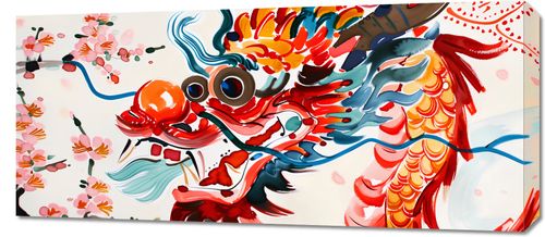 Obraz z serii motywy wschodnie zatytułowany Smok o Żywej Barwie Ten dynamiczny i kolorowy obraz przedstawia stylizowanego smoka, motyw często spotykany w azjatyckiej sztuce i kulturze. Smok ma żywe kolory: przeważają odcienie czerwieni, żółci, niebieskiego i bieli, co nadaje całości witalność i ekspresję. Cechy charakterystyczne smoka, takie jak łuski, przypominające płomienie grzebień oraz wyraziste, okrągłe oczy, są przerysowane, co dodaje postaci smoka teatralności i majestatu. Tło jest wypełnione delikatnymi kwiatami i kroplami farby, co sugeruje ruch i energię, jakby smok poruszał się w przestrzeni wypełnionej wiosennym kwitnieniem. Styl obrazu jest nowoczesny z tradycyjnymi wpływami, łączący elementy orientalnego malarstwa tuszem z nowoczesnymi technikami ilustracji. Będzie dobrym dopełnieniem sushi barów, jak i również przestrzeni w stylu wschodnim.