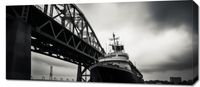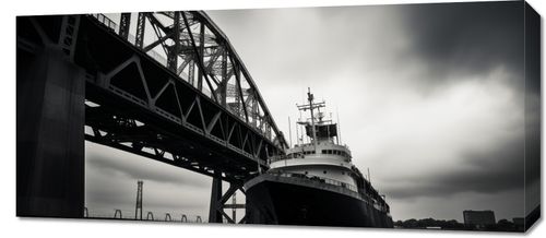 Obraz z serii pejzaże zatytułowany Statek przy Moście. Monochromatyczne przedstawienie statku pod imponującym mostem, gdzie struktury inżynieryjne łączą się z dynamicznym niebem, tworząc kompozycję symbolizującą siłę i postęp. Chłodna paleta barw i silne linie prowadzące oko przez obraz idealnie nadają się do nowoczesnych przestrzeni biurowych lub urbanistycznych salonów. Obraz ten przyciąga uwagę i inspiruje, odzwierciedlając majestat i piękno konstrukcji stworzonych przez człowieka.