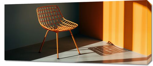 Obraz z serii wnętrza zatytułowany Świetlista Gra. Prezentuje on minimalistyczne podejście do designu, gdzie każda linia i kształt ma swoje znaczenie. Jasne odcienie pomarańczu rzucające się na prostą, ale stylową metalową krzesło tworzą dynamiczny efekt cienia i światła, który jest jednocześnie subtelnym, ale i wyrazistym elementem dekoracyjnym. Idealny dla nowoczesnych przestrzeni biurowych lub mieszkalnych, wprowadzając do nich artystyczną atmosferę z nutą awangardy. To dzieło sztuki doskonale komponuje się z surową elegancją współczesnych, urbanistycznych wnętrz.