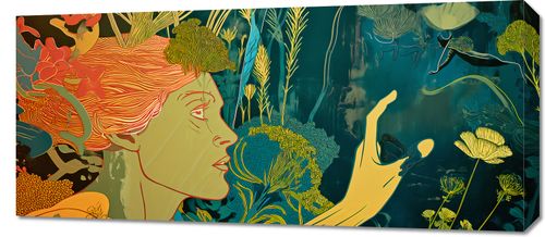 Obraz z serii abstrakcja zatytułowany Wezwanie do Flory, ukazuje poetycką synergię między ludzką postacią a naturą. Zanurzona w bogatym, zielonym otoczeniu, kobieta wydaje się być jednością z leśną fauną i florą, które są stylizowane w surrealistyczny sposób. Jej czerwone włosy przechodzą w płatki kwiatów, a kontury jej twarzy delikatnie współgrają z organicznymi kształtami roślin. Obraz ten, z jego żywymi kolorami i złożoną kompozycją, idealnie nadaje się do przestrzeni, która celebruje naturę i sztukę, takich jak galerie, nowoczesne mieszkania, lub przestrzenie publiczne o tematyce ekologicznej. Ta praca przyciąga wzrok i inspiruje do refleksji nad bliskimi związkami człowieka z przyrodą.