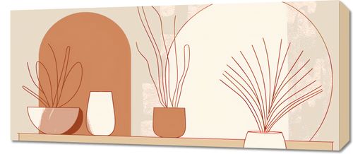 Obraz z serii boho zatytułowany Widok Roślin. Obraz przedstawia trzy stylizowane donice z roślinami, umieszczone na półce w harmonijnym ułożeniu, na tle geometrycznych kształtów w ciepłych, pastelowych kolorach. Proste linie i spokojne barwy tworzą atmosferę relaksu i spokoju, a subtelne tekstury dodają głębi i zainteresowania.Świetnie sprawdzi się w wnętrzach, które cenią sobie spokój i naturalne elementy, takich jak jasne salony, przytulne sypialnie lub miejsca wypoczynku. Jest to idealny wybór dla miłośników minimalizmu i skandynawskiej estetyki.