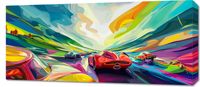 Obraz z serii abstrakcja zatytułowany Wyścig Przy Barwach. Ilustracja przedstawia zacięty wyścig klasycznych samochodów sportowych, zatopionych w dynamicznym, kolorowym świecie, który wydaje się rozpływać w ruchu. Żywe barwy tworzą poczucie ruchu i prędkości, a krzywizny drogi dodają poczucia głębi i trójwymiarowości. Dynamiczne niebo nadaje całości dramatyzmu, podkreślając emocje związane z wyścigami. Ten obraz idealnie nadaje się do wnętrz o nowoczesnym designie, garaży dla entuzjastów samochodowych, pokoi zabaw lub jako środek akcentujący w biurach. Jego energia i barwy mogą wprowadzić życie do każdego pomieszczenia, inspirując do działania i dynamiki.
