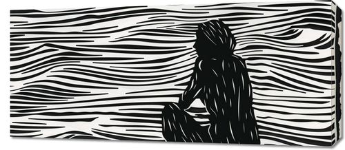 Obraz z serii abstrakcja zatytułowany Złożone Fluidalne Linie. Plakat przedstawia abstrakcyjną, czarno-białą ilustrację, w której kontrastowe, fluidalne linie tworzą efekt wzburzonej powierzchni wody. Na tej dynamicznie zarysowanej powierzchni wyłania się sylwetka osoby, która siedzi w skupieniu, z głową zwróconą w stronę obserwatora. Postać jest zredukowana do ciemnych, monochromatycznych bloków, co nadaje jej minimalistyczny, ale wyrazisty charakter. Sylwetka człowieka jest wyraźnie zarysowana i stanowi centralny punkt kompozycji, a jej kontury płynnie wtapiają się w abstrakcyjne tło. Ten artystyczny obraz łączy prostotę z głębią, sugerując kontemplację lub introspekcję. Jego prosta paleta barw i silne linie mogą przyciągać uwagę i inspirować do refleksji nad spokojem i złożonością ludzkiej natury.