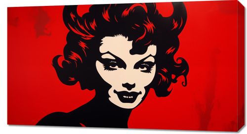 Obraz z serii pop art zatytułowany zatytułowany Czerwona Diablica. Na obrazie dominuje stylizowany portret kobiety w kontrastowych kolorach – głęboka czerń i intensywna czerwień tworzą silny wizualny kontrast, który przyciąga wzrok i intryguje. Wizerunek jest wyrazisty i graficzny, z mocnymi liniami i zredukowanym detalem, co nadaje mu nowoczesnego, prawie komiksowego charakteru. Kobieta jest przedstawiona z subtelnym uśmiechem i zmysłowym spojrzeniem, co nadaje jej tajemniczy i prowokujący charakter. Tło w jednolitym, żywym czerwonym kolorze podkreśla silną obecność postaci i jej niezaprzeczalny wpływ na otoczenie. Ten obraz jest hołdem dla klasycznej piękności i siły kobiecego wyrazu, idealnym dla przestrzeni, które pragną dodać odważnego stylu i charakteru.