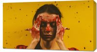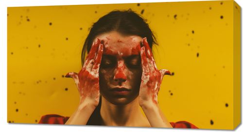 Obraz z serii abstrakcja zatytułowany Dotyk Ekspresji Własnej. Ten mocny wizualnie obraz przedstawia twarz kobiety z zamkniętymi oczami, z dłońmi pokrytymi czerwoną farbą opartymi na skroniach, co może symbolizować intensywność emocji, twórcze natchnienie lub ciężar myśli. Tło w jaskrawym żółtym kolorze, posypane czarnymi kropkami, dodaje energii i kontrastu, podkreślając dramatyzm i głębię sceny. Obraz ten może być interpretowany wielowymiarowo, nadając się do przestrzeni artystycznych, takich jak galerie, pracownie malarskie, a także jako wyraziste uzupełnienie nowoczesnego, miejskiego wnętrza.