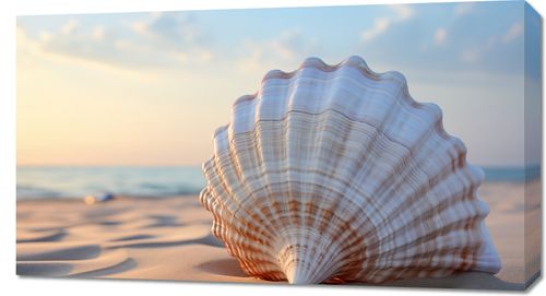 Obraz z serii natura zatytułowany Echo Morza. Delikatne, pastelowe barwy muszli występujące na pierwszym planie, z jej wyraźnymi liniami i subtelnym przejściem kolorów od kremowego do różowego, kontrastują z dynamicznym tłem zachodzącego słońca nad morzem. Złote refleksy światła na wodzie i miękki, piaskowy pierwszy plan tworzą poczucie głębi i spokoju. Idealny do wnętrz o tematyce morskiej, relaksacyjnych spa oraz jako element dekoracyjny w pokojach hotelowych z widokiem na morze.