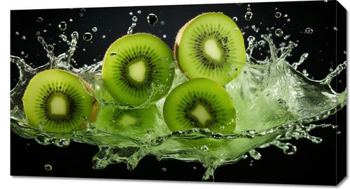 Obraz z serii wnętrza zatytułowany Energia Kiwi, przedstawia dynamiczny moment, gdy plasterki kiwi wchodzą w interakcję z rozpryskującą się wodą, tworząc wizualne spektakulum koloru i ruchu. Jasne zielenie owoców są wyraziste na tle ciemnego tła, a przezroczyste krople wody dodają kompozycji poczucia świeżości. Ten obraz przyciąga uwagę żywiołowością i świeżością, doskonale wpasowując się do przestrzeni, które pragną podkreślić zdrowy styl życia, takich jak kuchnie, jadalnie, studia fitness, spa, a także jako energetyzujący akcent w nowoczesnych biurach lub kawiarniach.