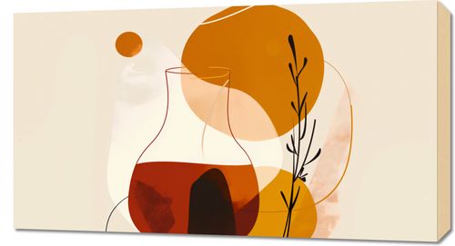 Obraz z serii minimalistyczne zatytułowany Esej o Barwach. To artystyczne dzieło przedstawia różnorodne, płynne formy i abstrakcyjne kształty w ziemistej palecie kolorów, takich jak głęboki pomarańcz, ciepły beż i elegancki brąz, dopełnione delikatnymi, czarnymi detalami roślin.Ten obraz świetnie odnajdzie się w nowoczesnym, minimalistycznym wnętrzu, które szuka ciepła i charakteru, dodając mu stylu i głębi. Będzie pasował do jasnych przestrzeni dziennych, gabinetów czy holów, wprowadzając element spokoju i skupienia.