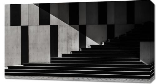 Obraz z serii pejzaże zatytułowany Geometria w Architekturze. Zjawiskowy kontrast światła i cienia na geometrycznych formach stwarza iluzję głębi i perspektywy, zachęcając widza do zadumy nad interakcją przestrzeni i światła. Czyste linie i wyraźne kontrasty doskonale komponują się z nowoczesnymi, minimalistycznymi oraz industrialnymi wnętrzami. Idealny dla przestrzeni biurowych, loftów oraz jako element dekoracyjny w galeriach sztuki współczesnej.