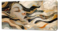 Obraz z serii abstrakcja zatytułowany Głębia. Prezentuje abstrakcyjne, stylizowane przedstawienie twarzy kobiety, zatopionej w płynnych, onirycznych formach przypominających fale lub wstęgi tkaniny. Szeroka gama barw, od głębokich czerni, przez delikatne beże, aż po złote i pomarańczowe akcenty, tworzy bogatą paletę kolorystyczną. Kontury twarzy są wyraźne i zmysłowe, z zamkniętymi oczami i lekko rozchylonymi ustami, co może sugerować stan zadumy lub ekstazy. Artystyczne linie tworzą złudzenie ruchu i płynności, a cała kompozycja jest zarówno dynamiczna, jak i harmonijna. Obraz ten może być interpretowany jako metafora piękna ludzkiego ducha, muzyki, sztuki lub emocji. Idealnie nadawałby się do eleganckich, nowoczesnych wnętrz, gdzie może stanowić główny punkt wizualny, przyciągając uwagę i inspirując do refleksji.