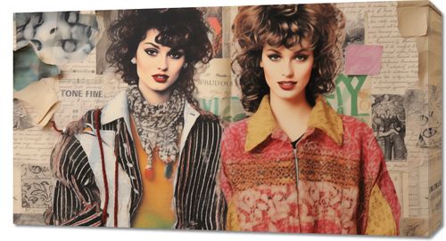 Obraz z serii pop art zatytułowany Ikony Stylu'80. Na tym nostalgicznie inspirowanym dziele sztuki widzimy dwie kobiety ubrane w odzież z lat 80., z charakterystycznymi, bujnymi fryzurami i wyrazistym makijażem. Ich postacie zostały umieszczone na tle kolażu z epoki, wypełnionego fragmentami starych gazet, ręcznych pism i ilustracji, co dodaje kontekstu historycznego i kulturowego. Silne kontrasty kolorystyczne i wyraźne linie twarzy podkreślają wyrazisty charakter obu postaci. Ten obraz to hołd dla mody i kultury lat 80., idealny dla przestrzeni, które pragną dodać retroflairu i odzwierciedlić ducha minionych dekad.