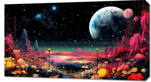 Obraz z serii pejzaże zatytułowany Inny Świat. Obraz ukazuje przepiękny, fantastyczny krajobraz, który łączy elementy kosmiczne z bujną, ziemską florą. Na pierwszym planie widzimy różnorodne, kolorowe kwiaty, które tworzą żywą, wręcz surrealną tapiserię natury. Za tym kwiatowym morzem rozciąga się widok na spokojne jezioro i majestatyczne, czerwone formacje skalne, które przywodzą na myśl marsjański krajobraz. W tle góruje olbrzymi księżyc, który dominuje na nocnym niebie pełnym gwiazd, a obok niego widnieje zarys konstelacji, dodając głębi i tajemniczości całej scenie. Obraz ten jest zaproszeniem do świata wyobraźni, gdzie natura i kosmos spotykają się w harmonii. Idealnie nadawałby się jako dekoracja do nowoczesnych przestrzeni mieszkalnych lub miejsc publicznych, które pragną wzbogacić swoje otoczenie o elementy fantastyczne i inspirujące do snucia marzeń.