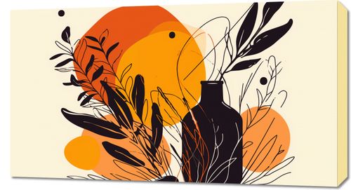 Obraz z serii minimalistyczne zatytułowany Jaskrawy Zachód. Na grafice widnieje silnie stylizowany motyw roślinny, gdzie czarne sylwetki roślin kontrastują z jaskrawo pomarańczowym i żółtym tłem, przypominającym zachodzące słońce. W tle pojawiają się delikatne, abstrakcyjne linie i kształty, dodające kompozycji głębi i tekstury.Ten plakat doskonale wpasuje się w wnętrza ożywione roślinnością, zarówno te domowe, jak i komercyjne przestrzenie typu kawiarnie lub sklepy z roślinami. Jego ciepłe barwy będą wprowadzać przytulną atmosferę i mogą stanowić żywy akcent w przestrzeniach utrzymanych w naturalnej kolorystyce.