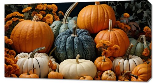 Obraz z serii natura zatytułowany Jesienne Urodzaje przedstawia bujne bogactwo jesieni. Centralne miejsce zajmuje soczysta, pomarańczowa dynia, królowa jesieni, otoczona przez różnorodność jej barwnych odmian. Niebieskawe i białe dynie tworzą wyjątkowy kontrast, a wszystko to uzupełnione jest przez złociste i burgundowe chryzantemy, które dodają kompozycji ciepła i głębi. Całość osadzona jest na tle w klasycznych, ciemnych odcieniach, co podkreśla elegancję i dojrzałość sezonu. Obraz ten idealnie wpasuje się w przestrzeń kuchni lub jadalni, dodając jej charakteru oraz ciepłego, domowego klimatu. Doskonale odnajdzie się także w przestrzeniach takich jak winiarnie czy restauracje serwujące sezonowe dania, gdzie podkreśli bogactwo i obfitość jesiennej palety smaków.