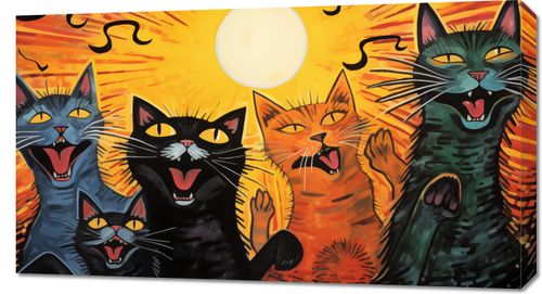 Obraz z serii abstrakcja, zatytułowany Kocie Koncertowanie. Ta dynamiczna i zabawna ilustracja przedstawia grupę kotów, które z entuzjazmem śpiewają lub miauczą w towarzystwie wschodzącego słońca, tworząc poczucie ruchu i życia. Intensywne kolory, wyraziste linie i humorystyczne wyraz twarzy kotów sprawiają, że dzieło to jest pełne energii i charakteru. Obraz jest idealnym dodatkiem do każdego pomieszczenia, szczególnie tam, gdzie chcemy dodać odrobiny ciepła, humoru i barw. Świetnie sprawdzi się w pomieszczeniach wspólnych, pokojach dziecięcych, a także w przestrzeniach kreatywnych lub jako prezent dla miłośników kotów.