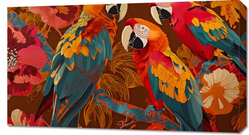 Obraz z serii abstrakcja zatytułowany Kolorowe Ary ukazuje grupę majestatycznych papug ara, których pióra w odcieniach głębokiego błękitu, gorącej pomarańczy i intensywnej czerwieni są ukazane z imponującym detalami. Ptaki są umieszczone na tle tropikalnych kwiatów i liści, tworząc barwną kompozycję, która przykuwa wzrok i przenosi obserwatora w odległe, egzotyczne krajobrazy. Dynamika i życie płynące z tego dzieła sprawiają, że jest ono idealnym wyborem dla pomieszczeń pełnych energii i pasji, takich jak kreatywne przestrzenie pracy, eklektyczne salony lub przestronne lobby hotelowe. Obraz ten celebruje różnorodność i piękno natury, przemawiając do tych, którzy cenią sobie przyrodę i kolor w swoim otoczeniu.