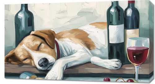 Obraz z serii abstrakcja zatytułowany Leniwe Popołudnie, przedstawia klimatyczną scenę wypoczynku. Na pierwszym planie widzimy spokojnie śpiącego psa, który wygodnie umieścił swoją głowę na drewnianej powierzchni, obok przewróconej butelki wina. Jego biało-brązowe umaszczenie kontrastuje z zielenią i burgundem butelek wina oraz rubinową głębią wina w szklance, dodając obrazowi domowej, przytulnej atmosfery. W tle delikatna tekstura popękanej ściany i dyskretnie rozmieszczone owoce nadają temu dziełu sztuki poczucie spokoju i domowego ciepła. Idealny do wzbogacenia wnętrza winiarni, salonu lub jako centralny punkt w przestrzeni, gdzie chcemy podkreślić miłość do zwierząt i chwile odpoczynku.