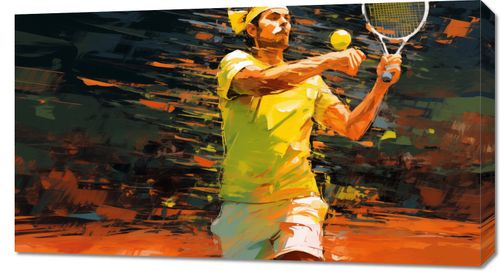 Obraz z serii abstrakcja zatytułowany Mistrzowski Serwis. Na tym żywiołowym dziele sztuki widzimy sylwetkę tenisisty w pełnym ruchu, wykonującego potężny serwis. Stylizacja obrazu przypomina impresjonistyczne pociągnięcia pędzla z żywymi plamami farby, które tworzą dynamiczny, prawie abstrakcyjny obraz akcji na korcie tenisowym. Barwy, od ciepłych żółci i pomarańczy do intensywnych cieni, podkreślają energię i pasję sportowej rywalizacji. To dzieło sztuki oddaje siłę, skupienie i elegancję tenisowej gry, będąc idealnym akcentem dla przestrzeni sportowych oraz dla miłośników i entuzjastów tenisa.