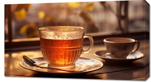 Obraz z serii wnętrza zatytułowany Moment Codzienności. Urokliwy obraz dwóch filiżanek herbaty, z których jedna uchwycona jest w chwili, gdy promienie porannego słońca przenikają przez jej bursztynową zawartość. Ciepłe światło i delikatna para unosząca się nad napojem emanuje atmosferę spokoju i przyjemności z porannego rytuału. Idealny do kuchni lub jadalni, aby dodać uczucie ciepła i domowego komfortu, a także doskonały jako prezent dla każdego miłośnika herbaty lub momentów refleksji.