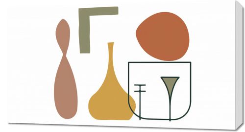 Obraz z serii boho zatytułowany Naczynia. Obraz prezentuje kolekcję abstrakcyjnych form, które przypominają różne przedmioty od naczyń po elementy dekoracyjne, tworząc estetyczną mieszankę linii i kształtów. Zestawienie spokojnych, pastelowych barw z silnymi, geometrycznymi figurami tworzy wizualnie przyjemną kompozycję, która zwraca uwagę swoją subtelną elegancją. To dzieło artystyczne jest doskonałym wyborem dla wnętrz o nowoczesnym designie, w których chcemy wprowadzić sztukę bez dominujących nad przestrzenią. Idealnie sprawdzi się jako delikatny akcent w przestronnym salonie, biurze czy jako część galerii w domowym korytarzu.