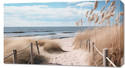 Obraz z serii pejzaże zatytułowany Nadmorski Most to tytuł tej zapierającej dech w piersiach ilustracji, która przemawia do duszy miłośnika morza. Delikatne trawy morskie tańczą w rytmie przybrzeżnego wiatru, a spokojne fale delikatnie docierają do złocistego piasku, tworząc melodię naturalnego spokoju. Nieskazitelnie błękitne niebo przechodzące w pastelowe odcienie na horyzoncie dodaje głębi i przestrzeni, tworząc obraz idealny do umieszczenia w przestrzeniach, które celebrują ciszę i kontemplację. Ten obraz będzie wyjątkowym dodatkiem do każdej plażowej chaty, salonu nadmorskiego domu, a nawet biura, przypominając o nieskończonej przestrzeni i wolności, jaką oferuje morze.