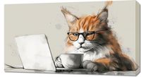 Obraz z serii abstrakcja zatytułowany Nie przed Kawusią. Przedstawia uroczy obraz kota o rudym umaszczeniu, który nosi okulary i wydaje się być zaczytany w ekranie laptopa. Scena jest przedstawiona w ciepłych, nasyconych barwach, które podkreślają miękkość i puszystość futra kota. Elementy graficzne, takie jak plamy i rozpryski farby, nadają kompozycji artystycznego charakteru. Filiżanka kawy umieszczona obok laptopa dodaje codziennej atmosfery, sugerując, że może to być obrazek z domowego biura lub miejsca relaksu. Ten obraz mógłby być idealnym elementem dekoracyjnym dla miłośników kotów i tych, którzy cenią sobie humor oraz lekkość w aranżacji swojego wnętrza, zarówno w domowym biurze, jak i w przestrzeni wypoczynkowej.