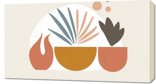Obraz z serii boho zatytułowany Paleta Roślinna.Ten obraz łączy geometryczną prostotę z motywami roślinnymi, tworząc czystą i nowoczesną interpretację natury. Stonowana kolorystyka z akcentami pastelowych barw wprawia w stan relaksu i spokoju. Motywy roślinne, stylizowane na abstrakcyjne kształty, wyłaniają się z prostokątnych doniczek, tworząc harmonijną całość. Jest to idealny wybór dla tych, którzy cenią sobie spokój i przytulność w swoim domowym zaciszu. Obraz będzie pasował do przestrzeni życiowej urządzonej w duchu skandynawskim lub minimalistycznym, gdzie prostota formy idzie w parze z naturalnym pięknem. Może ozdobić ściany w salonach, sypialniach lub biurach, gdzie wprowadzi odrobinę naturalnej estetyki bez przytłaczania przestrzeni.
